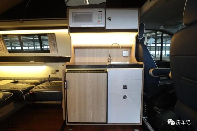 厨房区域:驾驶舱后方就是厨房区域,厨房的配置有车载冰箱,储物橱柜,凹型水池,微波炉。但是厨房区域的面积还是小了一点,在车内做饭不太方便,还是需要携带卡式炉去户外操作。一个紧凑的厨房也让生活区更加的宽阔。
