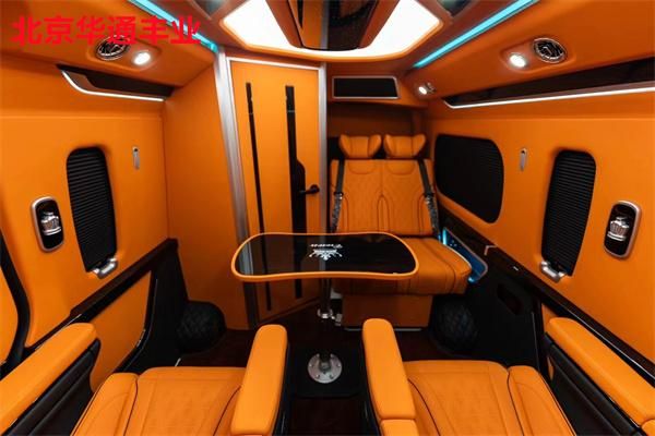 在舒适性方面,第二排配备了两张可360度旋转的航空级座椅,支持电动调节、加热、通风及按摩功能,搭配可伸缩的折叠桌板,方便乘客办公或用餐。第三排则采用联排沙发设计,可一键放平成临时休息床,座椅面料选用透气性极佳的意大利进口真皮,缝线工艺考究。车顶内嵌环绕式氛围灯带,支持多色调节,配合隐私窗帘和双层隔音玻璃,营造出静谧私密的乘坐环境。