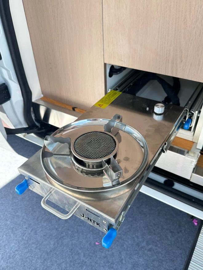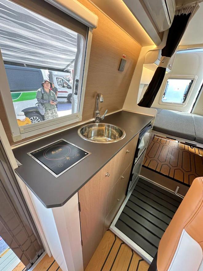 厨房区配备柴油抽拉灶、赛福乐12V自动启停水泵、150L不锈钢清水箱(含保温)及50L污水箱,英式快插水路与机械排污阀保障用水便利。