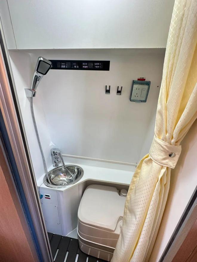 卫生间采用抽拉式设计,配备专用便携马桶、花洒及隐私帘,实现基础卫生功能与隐私保护。电路配置12V400AH锂电+600W太阳能板+3000W逆变器,支持双向换气扇、氛围灯、变频空调等全屋电器。水路系统包含150L清水箱、50L污水箱及外接充电线缆,双电池隔离系统与电路保护确保用电安全。